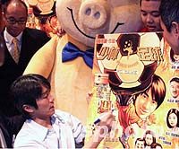 香港明星周星馳3日出席其主演的電影《少林足球》推出電腦游戲的記者會,宣傳即將開發(fā)的電腦游戲軟件。中新社圖 尤圣斌 攝