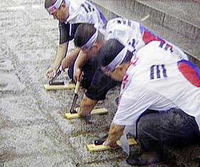 圖文:韓國(guó)20人斬?cái)嗍种缚棺h小泉參拜靖國(guó)神社 2001年08月13日 15:06 ![]() 法新/圖 中新網(wǎng)北京8月13日消息:韓國(guó)漢城二十人公開(kāi)斬?cái)嗍种,以血抗議日本首相小泉純一郎參拜靖國(guó)神社。 據(jù)韓國(guó)電視臺(tái)報(bào)道,二十名男子在漢城獨(dú)立門(mén)前抗議,高叫口號(hào),指責(zé)小泉純一郎到供奉戰(zhàn)犯的靖國(guó)神社參拜。男子接著拿出長(zhǎng)柄大鐮刀,斬?cái)辔仓缚棺h。 有目擊者表示,該批男子較早時(shí)被阻止在日本大使館前示威。警方暫時(shí)沒(méi)有評(píng)論事件。 |