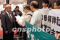 圖:江蘇民眾抗議小泉參拜靖國神社 2001年08月15日 17:19 ![]() 中國江蘇省崇山村村民,十五日在村委會前集會,抗議日本首相小泉參拜供奉著二戰(zhàn)甲級戰(zhàn)犯的靖國神社。日本侵華期間,有上百名崇山村民,無辜慘死在日本于此地進(jìn)行的細(xì)菌戰(zhàn)之中。 ![]() 香港多個團(tuán)體15日舉行示威游行,抗議日本首相小泉純一郎參拜靖國神社。圖為香港教聯(lián)會向日本駐港總領(lǐng)事館遞交抗議信函。中新社圖 盧峰 攝