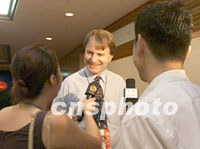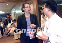 ![]() APEC2001年第三次高官會相關會議八月二十一日繼續(xù)在遼寧大連舉行,與會代表在會場外交流意見。中新社記者 滿會喬 攝 ![]() APEC2001年第三次高官會相關會議八月二十一日繼續(xù)在遼寧大連舉行,澳大利亞貿易官員白儒石接受記者采訪。中新社記者 滿會喬 攝