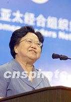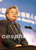![]() 2001年亞太經(jīng)合組織女領(lǐng)導(dǎo)人會(huì)議二十二日在北京人民大會(huì)堂開(kāi)幕,中國(guó)全國(guó)人大常委會(huì)副委員長(zhǎng)、中華全國(guó)婦女聯(lián)合會(huì)主席彭珮云在會(huì)上致詞。中新社記者 毛建軍 攝 |