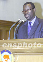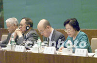 ![]() 聯(lián)合國環(huán)境規(guī)劃署官員巴克利·肯特四日在北京出席“21世紀論壇-綠色與環(huán)保2001年會議”,并作演講。中新社記者 滿會喬 攝 ![]() “21世紀論壇-綠色與環(huán)保2001年會議”四日在北京開幕,全國政協(xié)副主席葉選平(左一)、宋健(左二)、中國林業(yè)科學(xué)研究院院長江澤慧(右一)等出席開幕式。中新社記者 滿會喬 攝