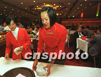 圖:為西部論壇客商服務(wù)小姐行唐代禮節(jié) 2001年09月05日 18:36 ![]() 西安唐樂(lè)宮的服務(wù)員五日以唐代禮節(jié)為參加西部論壇的賓客準(zhǔn)備茶水,會(huì)上近二百家國(guó)內(nèi)外企業(yè)的代表在此進(jìn)行了項(xiàng)目洽談。中新社記者 宋吉河 攝