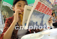 ![]() 十二日晨,美國遭襲后的消息在報(bào)紙刊登后,北京天安門廣場(chǎng)的游客仔細(xì)閱讀有關(guān)消息。中新社記者 錢興強(qiáng) 攝 ![]() 十三日晨,在北京麥當(dāng)勞餐廳前,前來用餐的顧客關(guān)注報(bào)紙上報(bào)道美國遭襲消息。中新社記者 錢興強(qiáng) 攝