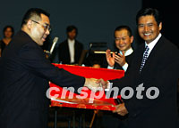 圖文:周潤發(fā)說,回歸后澳門變化很大 2001年10月05日 09:45 ![]() 由奧斯卡金像獎獲得者譚盾(右一)指揮、由多名國際音樂家和上海交響樂團演出的"臥虎藏龍"音樂會,4日晚在"第十五屆澳門國際音樂節(jié)"演出成功后,周潤發(fā)向音樂家表示祝賀。中新社圖 任晨鳴 攝 ![]() 香港巨星周潤發(fā)4日到澳門出席"第十五屆澳門國際音樂節(jié)"中的"臥虎藏龍"音樂會后,澳門特區(qū)政府社會文化司司長崔世安向周潤發(fā)頒發(fā)紀念品。中新社圖 任晨鳴 攝