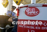 圖:APEC會議新聞中心出入關(guān)口 2001年10月13日 19:27 ![]() 本屆APEC會議的新聞發(fā)布廳設(shè)置在上海東方明珠大廈,目前出入大廈的人員都必須經(jīng)過門口警衛(wèi)的嚴格證件檢查。中新社圖 劉殊瑾 攝 |