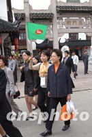![]() 出席APEC雙部長會議的部長夫人們十八日到千年水鄉(xiāng)古鎮(zhèn)朱家角參觀游覽,中國臺北“經(jīng)濟(jì)部長”夫人葉美吟對當(dāng)?shù)氐牟菥幭X蟈愛不釋手。中新社記者 王瑤 攝 ![]() 出席APEC雙部長會議的部長夫人們十八日到千年水鄉(xiāng)古鎮(zhèn)朱家角游覽,圖為香港工商局長周德熙夫人黃英琦(右)參觀古牌樓。中新社記者 王瑤 攝