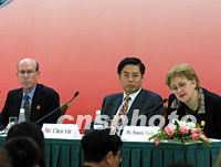 圖:e-APEC工作組在滬舉行新聞發(fā)布會 2001年10月19日 13:49 ![]() e-APEC工作組十九日在上海舉行新聞發(fā)布會,介紹數(shù)字APEC戰(zhàn)略。圖為工作組主席、來自中國信息產(chǎn)業(yè)部的陳因(中)、工作組副主席美國APEC官員拉里·格林伍德先生(左)和澳大利亞官員帕梅拉·費(fèi)伊利女士(右)在新聞發(fā)布會上。中新社記者 潘索菲 攝 |