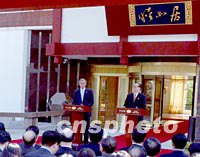 ![]() 十月十九日,美國(guó)總統(tǒng)布什在上海西郊賓館“睦如居”與中國(guó)國(guó)家主席江澤民會(huì)談,并共同在此舉行記者招待會(huì)!澳馈睘楹湍,“如”為如意。以此命名的江南風(fēng)格賓館,是外國(guó)元首下榻之地。中新社記者 賈國(guó)榮 攝
