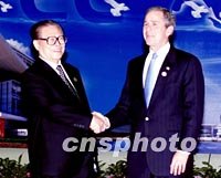 圖:江澤民迎接美國(guó)總統(tǒng) 2001年10月21日 11:33 ![]() 10月20日,中國(guó)國(guó)家主席江澤民在上海國(guó)際會(huì)議中心迎接美國(guó)總統(tǒng)布什。中新社圖 |