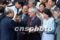 ![]() 中國加入WTO議定書簽字儀式于北京時間12日凌晨在多哈舉行,石廣生部長簽字后同各國代表一起舉杯慶祝中國成為WTO大家庭中的一員。中新社記者 錢興強 攝 ![]() 中國加入WTO議定書簽字儀式于北京時間12日凌晨在多哈舉行,石廣生部長簽字后與代表握手致意。中新社記者 錢興強 攝