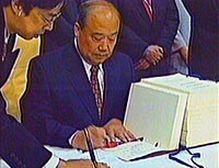 組圖:中國加入WTO議定書簽字儀式 2001年11月12日 02:07 ![]() 中國代表團團長石廣生于當?shù)貢r間11日晚在多哈簽署中國入世議定書。中新社記者 錢興強 攝 ![]() 中國代表團團長石廣生于北京時間十二日零點許在卡塔爾首都多哈喜來登飯店簽署中國加入世貿(mào)組織議定書。中新社圖