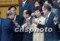![]() 中國加入WTO議定書簽字儀式于當?shù)貢r間11日晚在多哈舉行,石廣生部長簽字后與在場人士舉杯互致祝賀。中新社記者 錢興強 攝 |
