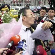 圖文:一討債公司老板向呂秀蓮求婚遭警方攔下 2001年12月11日 13:51 ![]() 呂秀蓮(資料圖片) ![]() 董念臺(tái)11日捧著99朵紅玫瑰,率領(lǐng)48輛豪華禮車,浩浩蕩蕩去向心儀許久的呂秀蓮求婚,但遭警方攔下。董念臺(tái)說不能阻止他求婚的意志。(張良一攝) 中新網(wǎng)香港12月11日消息:臺(tái)北訊,臺(tái)灣一討債公司負(fù)責(zé)人董念臺(tái)今天上午演出向呂秀蓮“求婚記”,不過求婚車隊(duì)在途中即遭到臺(tái)北市警察局?jǐn)r下,董念臺(tái)在不滿下憤而離去。 據(jù)“中央社”報(bào)道,對(duì)于今天的求婚之舉,董念臺(tái)稱,他欣賞呂秀蓮憨直、有話直說的個(gè)性,他認(rèn)為呂是位優(yōu)秀的女性。 上午九時(shí)許,由十二輛奔馳、十二輛卡迪拉克高級(jí)轎車組成的車隊(duì)從臺(tái)北市中正紀(jì)念堂出發(fā),浩浩蕩蕩準(zhǔn)備到“總統(tǒng)府”“求婚”。 車隊(duì)在抵達(dá)“總統(tǒng)府”前的貴陽(yáng)路遭轄區(qū)員警攔下,董念臺(tái)穿著燕尾服,手上拿著九十九朵玫瑰和一封求婚信件,他不滿指出,他與呂秀蓮男女未婚,答應(yīng)求婚與否固然是女方的權(quán)利,但求婚也是他的自由,這是人民應(yīng)有的民主法治。 董念臺(tái)說,如果說他妨礙交通,事前他已去函臺(tái)北市警局,但警方并未制止,現(xiàn)在又說他違反“集會(huì)游行法”,他認(rèn)為是警方違法在先。 稍后,董念臺(tái)認(rèn)為既然高攀不起,憤而將玫瑰花扔在地上后離去。 相關(guān)報(bào)道:真情?搞笑?臺(tái)灣一討債公司老板向呂秀蓮求婚 |