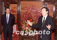 ![]() 中國(guó)國(guó)務(wù)院總理朱镕基二十六日在北京中南海會(huì)見前來述職的澳門特別行政區(qū)行政長(zhǎng)官何厚鏵。中新社記者 毛建軍 攝