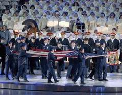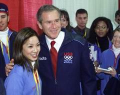 第十九屆冬季奧林匹克運(yùn)動(dòng)會(huì)開幕式組圖 2002年02月09日 11:26 ![]() 本屆冬季奧運(yùn)會(huì)會(huì)旗入場(chǎng)。(美聯(lián)圖) ![]() 美國運(yùn)動(dòng)員代表和紐約的消防員、警察代表持世貿(mào)中心破損的美國星條旗入場(chǎng)。(美聯(lián)圖) 冬奧會(huì)開幕式會(huì)場(chǎng)鳥瞰。 ![]() 美國總統(tǒng)布什開幕式前與美籍華裔知名花樣滑冰選手關(guān)穎珊合影。