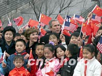 組圖:布什夫婦游覽長城 2002年02月22日 16:02 ![]() 美國總統(tǒng)布什與夫人勞拉二十二日登上北京八達嶺長城參觀游覽時,與歡迎的少年兒童合影。中新社記者 毛建軍 攝 ![]() 美國總統(tǒng)布什與夫人勞拉二十二日登上北京八達嶺長城。中新社記者 毛建軍 攝