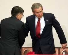 幽默和尷尬——外電報(bào)道布什訪華過程花絮(圖) 2002年02月22日 17:08 ![]() 清華校長王大中扶住差點(diǎn)絆倒的布什(美聯(lián)社) 中新網(wǎng)北京2月22日消息:布什對中國的訪問在坦誠和熱情的氣氛中進(jìn)行,兩國領(lǐng)導(dǎo)人就中美關(guān)系和國際形勢等重大問題進(jìn)行了重要的會(huì)談,而訪問過程中也出現(xiàn)了一些有趣的花絮。 布什遇上兩次小麻煩 據(jù)德新社報(bào)道,今天布什座車的輪胎在赴宴途中爆裂,迫使他換乘后面的車輛。當(dāng)時(shí)他剛結(jié)束在清華大學(xué)的演講,正趕往北京市中心的中南海與江澤民主席共進(jìn)午餐。布什被迫放棄自己的豪華轎車,但是沒有延誤他與江主席的會(huì)晤。爆胎是美國總統(tǒng)今天遇上的第二次尷尬。 此前,布什在清華大學(xué)的演講贏得了兩三百名學(xué)生的熱烈掌聲,但是提問環(huán)節(jié)結(jié)束后,他在走過講臺(tái)準(zhǔn)備與中國官員握手時(shí)腳底絆了一下。布什顯然試圖化解這一尷尬場面,順勢做了要與一名中國官員擁抱的樣子。 清華演講不乏幽默 美國的《紐約時(shí)報(bào)》的報(bào)道說,布什在中國高等學(xué)府清華大學(xué)的演說時(shí)有幽默之處。在提問環(huán)節(jié),布什的中文譯員最開始居然準(zhǔn)備把總統(tǒng)的回答翻譯成她自己“出色”的英語。布什笑著說:“她在糾正我的英語! 還有一次,一名學(xué)生問布什是否鼓勵(lì)自己的雙胞胎女兒來中國學(xué)習(xí)。布什再次笑答:“恐怕她們不再聽我的話啦,如果你明白我的意思的話。”