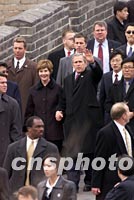 圖:布什與夫人在八達(dá)嶺長(zhǎng)城 2002年02月22日 19:26 ![]() 美國總統(tǒng)布什與夫人勞拉二十二日下午在警衛(wèi)和陪同人員簇?fù)硐拢d致勃勃地登上北京八達(dá)嶺長(zhǎng)城。中新社記者 毛建軍 攝
