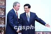 圖:國家副主席胡錦濤與美國總統(tǒng)布什握手告別 2002年02月22日 19:52 ![]() 中國國家副主席胡錦濤二十二日在北京清華大學(xué)與美國總統(tǒng)布什握手告別。中新社記者 賈國榮 攝