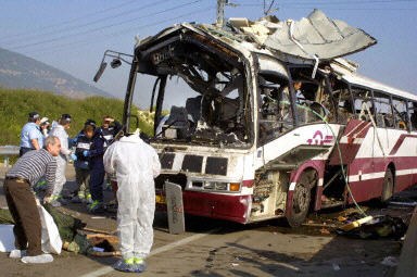 圖文:以色列海法公車遭自殺炸彈襲擊10人死亡 2002年04月10日 14:04 ![]() 圖為被炸彈襲擊的公車。法新社圖 中新網(wǎng)北京4月10日消息:法新社援引以色列醫(yī)院方面的消息說,今天在以色列北部城市海法的公車自殺炸彈襲擊事件中,至少有10人死亡,另有20人受傷。 當?shù)剀姺诫娕_的報道也援引紅十字會性質(zhì)組織的消息說,至少有10人死亡。據(jù)目擊者說,這次爆炸將遇襲公車的車頂炸穿。 而路透社的報道則說,上述緊急救援組織的的官員說,有8人在爆炸中死亡。以色列的媒體早先報道的死亡數(shù)字為10人。 報道還援引警方和救援工作者的消息說,一名自殺炸彈襲擊者今天上午交通高峰期在一輛擁擠的公車上引爆炸彈,造成至少8人死亡,12人受傷。 哈馬斯組織軍事派別宣稱對海法自殺炸彈襲擊負責 中新網(wǎng)北京4月10日消息:卡塔爾半島電視臺報道說,哈馬斯組織的軍事派別今天宣布對發(fā)生在以色列北部城市海法的自殺炸彈襲擊事件負責。 哈馬斯組織的“埃澤丁——卡薩姆旅”打電話給半島電視臺駐西岸城市拉姆安拉的辦公室,宣稱對此事負責。 一名自殺炸彈襲擊者今天上午交通高峰期在海法市一輛擁擠的公車上引爆炸彈,造成至少10人死亡,約20人受傷。 以色列總理沙龍的一名助手聲稱,巴勒斯坦領(lǐng)導(dǎo)人阿拉法特應(yīng)對這起恐怖襲擊事件負責。 巴勒斯坦:海法襲擊是對沙龍骯臟戰(zhàn)爭的“自然反應(yīng)” 中新網(wǎng)北京4月10日消息:巴勒斯坦政府表示,今天發(fā)生在以色列城市海法的公車爆炸事件是對以色列總理沙龍“骯臟戰(zhàn)爭的自然反應(yīng)”。 據(jù)法新社報道,巴勒斯坦內(nèi)閣秘書阿卜杜拉赫曼說:“沙龍對此負有責任。他是對巴勒斯坦人民和民族權(quán)力機構(gòu)發(fā)起骯臟侵略的人! 阿卜杜拉赫曼還說:“這是對這場骯臟戰(zhàn)爭和發(fā)生在難民營的事件的自然反應(yīng)! 哈馬斯組織的軍事派別今天打電話給半島電視臺駐西岸城市拉姆安拉的辦公室,宣稱對此海法的自殺炸彈襲擊事件負責。 以色列官員稱阿拉法特應(yīng)對自殺炸彈襲擊負責 中新網(wǎng)北京4月10日消息:以色列官員今天說,巴勒斯坦領(lǐng)導(dǎo)人阿拉法特應(yīng)為海法市的自殺炸彈襲擊事件負責。 據(jù)法新社報道,以色列總理沙龍的助手說:“亞瑟·阿拉法特對這起恐怖襲擊事件負責,這再次證明他對恐怖主義無所作為,相反他在鼓勵這種行為。” 這名以色列官員還說,這次襲擊事件“只能證明繼續(xù)3月29日開始的對恐怖主義基礎(chǔ)組織的軍事行動是合理的”。 自從3月29日海法市發(fā)生自殺炸彈襲擊事件以來,以色列就對西岸地區(qū)發(fā)動大規(guī)模軍事行動,并將巴勒斯坦領(lǐng)導(dǎo)人阿拉法特圍困在拉姆安拉的總部。