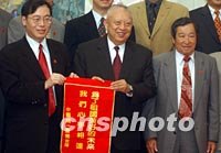 董建華會(huì)見(jiàn)臺(tái)灣"中國(guó)統(tǒng)一聯(lián)盟一國(guó)兩制參訪團(tuán)" 2002年04月11日 08:38 ![]() 香港特區(qū)行政長(zhǎng)官董建華,4月10日在香港禮賓府會(huì)見(jiàn)臺(tái)灣中國(guó)統(tǒng)一聯(lián)盟“一國(guó)兩制參訪團(tuán)”,團(tuán)長(zhǎng)王津平(左一)向董建華贈(zèng)送錦旗。中新社記者 任晨鳴 攝