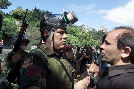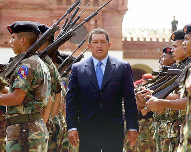 委內(nèi)瑞拉將領(lǐng)稱總統(tǒng)失去權(quán)力 軍隊(duì)控制國家(圖) 2002年04月12日 10:40 委內(nèi)瑞拉10名高級(jí)軍官11日發(fā)表聲明,要求總統(tǒng)查韋斯下臺(tái).圖為2002年2月4日委內(nèi)瑞拉總統(tǒng)在首都加拉加斯檢閱軍隊(duì)。法新圖
