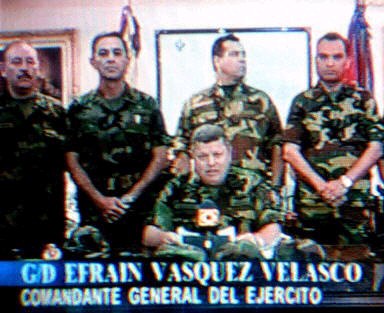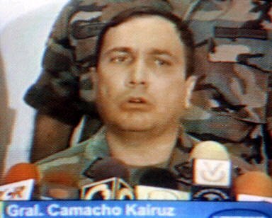 多圖:委內(nèi)瑞拉高級(jí)將領(lǐng)發(fā)表電視講話加入叛軍 2002年04月12日 12:22 ![]() 委內(nèi)瑞拉當(dāng)?shù)貢r(shí)間4月11日晚(北京時(shí)間12日上午),國(guó)民警衛(wèi)隊(duì)的卡伊魯茲將軍宣布,總統(tǒng)查韋斯的政府已經(jīng)"不再履行其職能",全國(guó)局勢(shì)已經(jīng)被軍隊(duì)控制。此前已有多名高級(jí)軍官宣布不承認(rèn)總統(tǒng)查韋斯,并要求其下臺(tái)。圖為委內(nèi)瑞拉軍隊(duì)司(中).(春風(fēng))