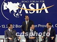 圖:中國經(jīng)濟高官在博鰲亞洲論壇上談入世 2002年04月12日 19:37 ![]() 博鰲亞洲論壇首屆年會十二下午舉行議題討論會,中國高官人民銀行行長戴相龍、信息產(chǎn)業(yè)部長吳基傳、國家稅務(wù)總局局長金人慶、中國保險監(jiān)督管理委員會主席馮曉增(由右至左)分別就各自相關(guān)行業(yè)與中國入世關(guān)系發(fā)表演講。中新社記者 滿會喬 攝