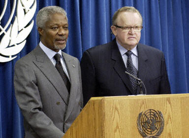 聯(lián)合國秘書長安南任命杰寧難民營真相調(diào)查團(圖) 2002年04月23日 09:47 聯(lián)合國秘書長安南與芬蘭前總統(tǒng)阿赫蒂薩里在新聞發(fā)布會上。(法新圖) 中新網(wǎng)北京4月23日消息:聯(lián)合國秘書長安南星期一說,芬蘭前總統(tǒng)阿赫蒂薩里將率領(lǐng)調(diào)查團,前往西岸巴勒斯坦城市杰寧的難民營。 據(jù)德新社報道,安南表示這是根據(jù)聯(lián)合國安理會的決議作出的決定。安理會上周對美國的提議進行表決,決定向杰寧難民營派出調(diào)查團,調(diào)查有關(guān)以色列制造屠殺的指控。 聯(lián)合國前難民事務(wù)專員日本人緒方貞子和國際紅十字會前主席瑞士人索馬魯加都將參加這個調(diào)查團,退役的美國將軍威廉·納什和曾經(jīng)領(lǐng)導(dǎo)過駐波斯尼亞聯(lián)合國警察部隊的愛爾蘭人菲茨杰拉德將擔(dān)任調(diào)查小組的軍事顧問。 安南表示:“這個小組的成員都是經(jīng)驗豐富,具有較高水準(zhǔn)的專業(yè)人士。我需要有一個具有獨立意志的調(diào)查小組!