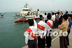 湄洲媽祖金身首次直航金門(mén)巡安 創(chuàng)下多個(gè)第一 2002年05月09日 10:03 ![]() 湄洲祖廟媽祖金身于本月8日從湄洲島客運(yùn)碼頭起駕,直航金門(mén)進(jìn)行為期5天的巡安活動(dòng)。這是50多年來(lái)媽祖金身首次以海上直航的方式出巡,也是湄洲島首次實(shí)現(xiàn)對(duì)金門(mén)的直航。圖為湄洲群眾依依不舍地向遠(yuǎn)去的金門(mén)“太武號(hào)”船告別。鄭憲 攝