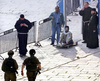 詳訊:39名巴勒斯坦武裝人員今天離開圣誕教堂 2002年05月10日 14:10 圖為受腿傷的武裝人員。法新圖 中新網北京5月10日消息:伯利恒當?shù)貢r間5月10日上午(北京時間5月10日中午),被困伯利恒圣誕教堂長達五周之久的39名巴勒斯坦武裝人員今天被幾輛公共汽車帶走。根據歐盟調解的協(xié)議,其中13名以色列方面強烈通緝的武裝人員將被一架英國軍用飛機帶往塞浦路斯,然后轉往幾個歐洲國家。另外26名武裝人員將被帶往加沙地區(qū)。 據以色列軍方的一位發(fā)言人稱,載有13名巴方武裝人員的公共汽車已經抵達教堂附近的一個軍事基地,其中一名武裝人員將在那里接受腿傷治療,然后他們將被帶往特拉維夫附近的一個機場。 另據報道,英國一架軍用飛機已經離開塞浦路斯基地,前往以色列引渡13名巴勒斯坦武裝人員,這些武裝人員曾在伯利恒的圣殿教堂與以色列軍方對峙交火。 這架軍用飛機的型號是綽號“大力神”的C-130型運輸機,塞浦路斯官員表示,“有關方面通知我們這架飛機是前往以色列引渡巴勒斯坦人員的! 塞浦路斯曾于本周四與歐盟官員進行過協(xié)商,并決定暫時收容這13名巴方武裝人員。官員們預計這些武裝人員將在塞浦路斯停留至下周一,然后由歐盟外長會議決定他們應當被引渡到何地。被引渡的13名武裝人員中包括伯利恒的巴勒斯坦情報部門的首腦阿卜杜拉-道德(Abdullah Daoud)。 根據以巴雙方達成的和解協(xié)議,在這13名巴方的武裝人員被引渡到歐盟國家以后,另外26名巴方人員將被帶到加沙地區(qū),以方還將釋放大約85名平民。(春風)