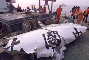 圖文:打撈起重要飛機(jī)殘骸 搜尋范圍進(jìn)一步縮小 2002年05月12日 07:32 ![]() “五-七”空難現(xiàn)場(chǎng)又打撈出一塊較大的飛機(jī)殘骸,殘骸上“中國(guó)北”三個(gè)字清晰可見(jiàn)。(中新社記者王麗南攝) 中新網(wǎng)大連5月12日消息:昨日深夜11時(shí)25分,交通部救撈局局長(zhǎng)宋家慧給新華社記者打手機(jī)說(shuō):“今天搜救工作取得重要進(jìn)展,打撈起飛機(jī)頂蓋、起落架、應(yīng)急發(fā)電機(jī)、應(yīng)急門、輪胎等重要飛機(jī)殘骸,這將對(duì)事故原因分析起到重要作用。” 據(jù)新華社報(bào)道,宋家慧的聲音在電話里提高了聲調(diào):“更重要的是,根據(jù)已打撈出水的機(jī)頭殘骸到機(jī)尾殘骸的位置,我們已經(jīng)把飛機(jī)墜落的區(qū)域縮小在長(zhǎng)600米、寬400米東西方向海域內(nèi),為下一階段的‘黑匣子’打撈和搜救工作開(kāi)展打開(kāi)了新的局面! 據(jù)宋家慧介紹,明天一些救撈船只將暫時(shí)調(diào)離現(xiàn)場(chǎng),等待從國(guó)外調(diào)集的“黑匣子”專用控測(cè)設(shè)備到達(dá)后再次展開(kāi)新一輪打撈工作。(完)