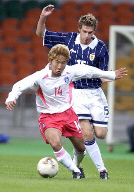 4-1完美屠戮蘇格蘭隊 太極虎韓國熱身也瘋狂(圖) 2002年05月16日 22:21 ![]() 李天秀為韓國隊敲開勝利之門 中新網漢城5月16日消息:在剛剛結束的一場世界杯熱身比賽中,東道主之一的韓國主場發(fā)揮神勇,以4-1完美“屠殺”了前德國國家隊主教練福格茨執(zhí)教的蘇格蘭隊,從而完成了6場熱身不敗。其中李天秀成為場上最耀眼的明星,他的第一個進球堪稱世界級,而安貞煥則梅開二度。韓國隊的另外一個入球由尹晶煥完成,蘇格蘭隊由首次入選國家隊的多比打入一粒安慰性入球。 蘇格蘭由于沖擊世界杯失利,球隊面臨著重組。在福格茨上任后在上個月的第一場國家隊比賽中,就以0-5慘敗給法國隊。在與韓國隊的比賽中,由于多名主力因傷缺陣,因此球隊的實力又打了折扣。 比賽的僵局在第15分鐘就打破,號稱韓國“天才新秀”的李天秀得到后場長傳后,利用嫻熟的個人技術盤過了幾名防守隊員后,又帶球過了門將,在對方最后一名后衛(wèi)的干擾下,冷靜的將球鏟射入網。 一球領先的韓國隊得勢不饒人,四分鐘之后,李天秀在左邊的射門稍稍偏出。隨后,李榮杓傳球給黃善洪,對方門將在撲了一下后球險些滾入大門。相對而言,蘇格蘭則顯得沒有多少機會。 下半場希丁克用在意大利佩魯賈俱樂部效力的安貞煥換下了老將黃善洪。安貞煥很快就表現(xiàn)出過人的實力,他在第57分鐘一腳有力的遠射將球打進。第67分鐘,同樣替補上場的中場尹晶煥同樣在禁區(qū)外抽射,將比分擴大為3比0。第74分鐘,卡首次出場的蘇格蘭前鋒多比接隊友開出的任意球,頭球攻門得手。補時階段,安貞煥以一記精準的挑射再下一城。 在隨后的比賽中,韓國還將與英格蘭和法國隊進行熱身。(宋方燦)