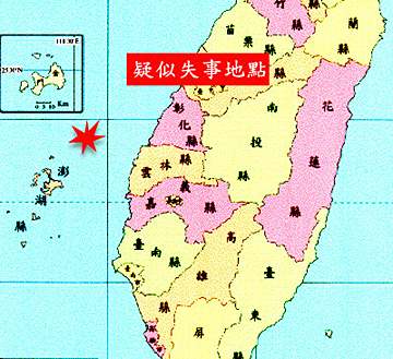圖:臺(tái)灣墜?蜋C(jī)墜海地點(diǎn)示意圖 2002年05月25日 19:06 ![]() (中時(shí)電子報(bào)圖) 鄭重聲明:關(guān)于臺(tái)灣華航飛機(jī)失事的新聞信息,系中新網(wǎng)特稿,未經(jīng)書(shū)面授權(quán),不得采用。