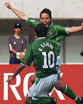 雙方各打半場(chǎng)好球 "雄獅"喀麥隆1-1平愛(ài)爾蘭(圖) 2002年06月01日 16:44 ![]() 愛(ài)爾蘭隊(duì)球員羅比-基恩與隊(duì)友為霍蘭德的進(jìn)球而歡呼。共同社圖 中新網(wǎng)東京6月1日消息:在剛剛在日本新瀉結(jié)束的世界杯外圍賽E組的首回合的第一場(chǎng)比賽中,“非洲雄獅”喀麥隆隊(duì)在領(lǐng)先一球的大好形勢(shì)下,被“綠衣男孩”愛(ài)爾蘭隊(duì)將比分追平,雙方以1-1結(jié)束了比賽。 由于隊(duì)長(zhǎng)羅伊·基恩在世界杯前因?yàn)楹徒叹毑缓投顺觯瑦?ài)爾蘭隊(duì)的實(shí)力大打折扣。為此,愛(ài)爾蘭不得不以22人參加世界杯的比賽。而喀麥隆隊(duì)陣容完整,賽前顯得信心十足,表示要學(xué)習(xí)塞內(nèi)加爾好榜樣,全取3分。 上半場(chǎng)喀麥隆隊(duì)表現(xiàn)出色,他們利用嫻熟的個(gè)人技術(shù),不但向愛(ài)爾蘭隊(duì)的腹地發(fā)動(dòng)沖擊。在鋒線上,在比賽中,姆博馬和埃托奧配合默契,給對(duì)手以很大的壓力。相對(duì)而言,愛(ài)爾蘭則遲遲沒(méi)有找到感覺(jué),在比賽中顯得節(jié)奏有些跟不上,顯得很被動(dòng)。比賽僵局在第39分鐘打破,埃托奧在右路利用出色的個(gè)人技術(shù)撕開對(duì)手的防線,并且將門將吸引出來(lái),隨后他將球傳給門前的姆博馬,后者一蹴而就,率先破門得手。 此后,一球在手的喀麥隆隊(duì)開始有些放松,最終在上半場(chǎng)以1-0結(jié)束該場(chǎng)比賽。在下半場(chǎng),愛(ài)爾蘭隊(duì)開始顯示出他們預(yù)選賽淘汰荷蘭隊(duì)的比賽中的素質(zhì),開始控制了比賽節(jié)奏。 下半場(chǎng)開始7分鐘后,愛(ài)爾蘭人的努力得到回報(bào),由于喀麥隆隊(duì)后衛(wèi)解圍時(shí)出現(xiàn)低級(jí)失誤,將球送到中路愛(ài)爾蘭隊(duì)霍蘭德的腳下,后者迎球怒射,幸運(yùn)的將球送入對(duì)方大門。 此后,愛(ài)爾蘭圍著喀麥隆隊(duì)的大門狂轟濫炸,其中一次射門擊中門柱,但是只開花不結(jié)果,最終雙方以1-1握手言和。 愛(ài)爾蘭(442):吉文;凱利,哈特(77分鐘,雷德),斯湯頓,布林;麥卡蒂爾(46分鐘,菲南),霍蘭德,基爾巴尼,金塞拉;達(dá)夫、羅比-基恩 喀麥隆(3-5-2):門將:阿利烏姆;沃姆,宋,卡拉;查托,格雷米,勞倫,福,奧萊姆貝;埃托奧、姆博馬(69分鐘,蘇佛)