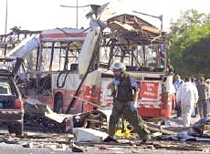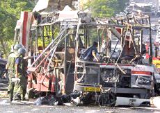 耶路撒冷市中心公共汽車爆炸案已有18人死亡(圖) 2002年06月18日 15:29 ![]() ![]() 被襲擊的公共汽車 中新網(wǎng)北京6月18日消息:以色列電視二臺(tái)18日?qǐng)?bào)道說(shuō),耶路撒冷市中心當(dāng)日上午發(fā)生公共汽車自殺炸彈襲擊事件,造成17人死亡。 報(bào)道沒(méi)有說(shuō)明死亡人數(shù)中是否包括自殺炸彈襲擊者本人。這起自殺性炸彈襲擊還造成車上32人受傷。 這輛公共汽車從耶路撒冷南郊的吉羅猶太人區(qū)開往市中心,當(dāng)時(shí)正是交通高峰時(shí)段。 阿克薩烈士旅宣稱對(duì)耶路撒冷公汽爆炸案負(fù)責(zé) 中新網(wǎng)北京6月18日消息:黎巴嫩真主黨游擊隊(duì)的電視臺(tái)18日接到匿名電話,此人聲稱“阿克薩烈士旅”對(duì)耶路撒冷爆炸案負(fù)責(zé)。 德新社援引該電視臺(tái)的報(bào)道說(shuō),這次炸彈襲擊是為了“阿克薩烈士旅”在伯利恒的領(lǐng)導(dǎo)人蘇布赫17日被殺而進(jìn)行的報(bào)復(fù)。 耶路撒冷南部18日交通高峰時(shí)段發(fā)生公共汽車爆炸案,造成13人死亡,40人受傷,其中5人情況危急。 哈馬斯組織也聲稱對(duì)耶路撒冷公汽爆炸案負(fù)責(zé) 中新網(wǎng)北京6月18日消息:巴勒斯坦激進(jìn)的“伊斯蘭抵抗運(yùn)動(dòng)”(哈馬斯組織)18日宣稱對(duì)耶路撒冷公共汽車爆炸案負(fù)責(zé)。 有人給法新社打去匿名電話,聲稱哈馬斯組織的軍事派別“卡薩姆旅”實(shí)施了這次行動(dòng)。 另?yè)?jù)報(bào)道,黎巴嫩真主黨游擊隊(duì)的電視臺(tái)也接到匿名電話,此人聲稱“阿克薩烈士旅”對(duì)耶路撒冷爆炸案負(fù)責(zé)。 耶路撒冷市中心18日交通高峰時(shí)段發(fā)生公共汽車爆炸案,造成17人死亡,約30人受傷。 沙龍親臨耶路撒冷爆炸現(xiàn)場(chǎng)拒談巴勒斯坦建國(guó) 中新網(wǎng)北京6月18日消息:在耶路撒冷市中心發(fā)生造成17人死亡的公汽爆炸案后,以色列總理沙龍18日拒絕巴勒斯坦建國(guó)。 據(jù)法新社報(bào)道,沙龍?jiān)谑掳l(fā)現(xiàn)場(chǎng)對(duì)記者表示:“你還能談什么巴勒斯坦國(guó)家!边@是沙龍出任總理以來(lái)首次親往巴勒斯坦人自殺炸彈襲擊現(xiàn)場(chǎng)視察。 沙龍?jiān)跀?shù)十名警察和保鏢的簇?fù)硐卤硎荆骸拔覀兘裉煲姷降氖前屠账固箍植乐髁x,我們必須打擊這種恐怖主義,這也正是我們?cè)谧龅摹!?/p> 美國(guó)官員最近提出建立臨時(shí)的巴勒斯坦國(guó)家的構(gòu)想,并通過(guò)談判確定其最終的形式。 18日的自殺性炸彈襲擊發(fā)生之際,美國(guó)總統(tǒng)布什正準(zhǔn)備宣布其中東和平新戰(zhàn)略。 耶路撒冷公汽爆炸案造成18名以色列人死亡 中新網(wǎng)北京6月18日消息:18日在耶路撒冷市中心,一名巴勒斯坦人在公共汽車上引爆炸彈,造成18名以色列人死亡,其中包括一些學(xué)童。 據(jù)法新社報(bào)道,醫(yī)院官員透露說(shuō),48名傷者正在接受治療,其中包括數(shù)名年齡在10到12歲之間的兒童。 報(bào)道還說(shuō),一名婦女在入院后不久就不治身亡,另外還有6名傷者的傷勢(shì)嚴(yán)重。 相關(guān)報(bào)道:耶路撒冷南部發(fā)生公車爆炸 13人死亡40人受傷