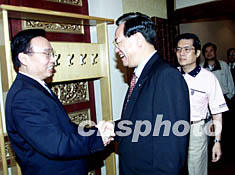 圖:海協(xié)秘書長李亞飛宴請"海聯(lián)會"參訪團(tuán) 2002年06月23日 20:50 ![]() 海協(xié)會秘書長李亞飛二十三日在北京宴請何智輝率領(lǐng)的臺灣“海聯(lián)會”參訪團(tuán)。滿會喬 攝