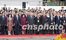 圖文特寫:迎接“大日子” 天空為香港升旗放晴 2002年07月01日 10:45 ![]() ![]() 香港舉行升旗儀式慶祝回歸五周年。七月一日,香港金紫荊廣場舉行隆重的升旗儀式,慶祝特區(qū)政府成立五周年。中新社傳真 潘索菲 攝 中新社香港七月一日電(記者徐足之)喜看今日香港城中,正是五星紅旗和紫荊旗的天下!今天是香港特區(qū)成立五周年紀念日,也是第二屆特區(qū)政府宣誓就職日,香港用莊嚴的升旗儀式,迎接這個特別日子的到來。 早上八點整,香港會議展覽中心金紫荊廣場,升旗儀式在洪亮的國歌聲中進入高潮,八百名嘉賓肅穆而立,目送中華人民共和國國旗和香港特別行政區(qū)區(qū)旗(紫荊旗)同時迎風飄揚而起。站在最前排的特首董建華、全國政協副主席霍英東、中聯辦主任姜恩柱,放聲唱起了國歌。 今天早晨重復了五年前難忘的一幕:大雨如注。但天公作美,升旗前后四十分鐘內,天空放晴,升旗結束才十分鐘,大雨又自天而降。一位講英語的西方記者興奮地說,五年前的今天早晨,也是大雨傾盆,這是一個很有意思的巧合,給人留下深刻的印象。 升旗儀式由主持人廣播主持。董建華在升旗儀式后緊接著的新政府就職典禮上將宣誓就任第二任行政長官。所以,在升旗儀式過程中,董建華倍享尊榮,早上七時五十五分,主持人廣播“董建華進場了”,八時零五分儀式完畢,主持人廣播“恭請董建華第一個離場”。全場嘉賓和中外媒體的記者兩次將期待的目光聚焦在董建華身上。 除了穿西服的嘉賓外,香港各區(qū)民政事務局組織的市民,構成升旗儀式上一道美麗的風景:他們穿特制的慶回歸五周年T恤,手上搖著的是繪有香港標志的小圓扇,握著的是書頁大小的國旗和香港區(qū)旗,兒童和青年人領囗下別著國旗和區(qū)旗的連體徽章。 站在最前面的市民,微笑著地回答一長排記者的提問,有的答為了準備看今天的升旗儀式,早晨四點多就起床了;有的答之所以要搶在最前面的位置,要在升旗儀式上看看。 今天是香港的公眾假日,大部分市民在家中收看直播實況,香港無線電視、亞洲電視、有線電視、香港電臺和商業(yè)電臺都對升旗儀式做了現場直播。一些市民大早走上街頭,在香港著名的海運大廈和時代廣場的戶外電視屏幕上觀看直播。