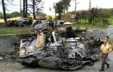 圖文:一警官?gòu)膲嫐У膱D-154殘骸前經(jīng)過 2002年07月03日 14:30 德國(guó)當(dāng)?shù)貢r(shí)間7月1日夜(北京時(shí)間2日晨),一架DHL公司的波音757貨機(jī)和俄羅斯巴什基爾航空公司的圖-154客機(jī)在德國(guó)巴登-符騰堡州于伯林根鎮(zhèn)上空相撞并墜毀,造成71人死亡,其中包括52名兒童。圖為一名警官?gòu)膲嫐У膱D-154殘骸前經(jīng)過。(春風(fēng))