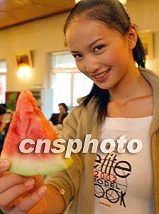 ![]() 正在西藏參加姍拉娜2002世界精英模特大賽中國選拔賽的模特選手,對拉薩的高原氣候不太適應(yīng),餐桌上的西瓜成為佳麗們的搶手貨。錢興強 攝