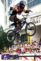 圖:中國極限精英賽街市決賽 2002年08月12日 16:30 ![]() 北京選手于秒在八月北京舉行的中國極限精英賽街市決賽中,高空雙手撒把體現(xiàn)了極限運動的驚險刺激。作者:史利