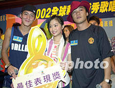 ![]() 歌星陳奕迅、陳冠希8月15日在香港出席「2002全球華人新秀歌唱大賽(香港區(qū)選拔賽)」記者會(huì),陳奕迅會(huì)上模仿陳冠希的臺(tái)風(fēng),頗為古怪有趣。鄧慶樂 攝