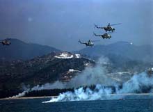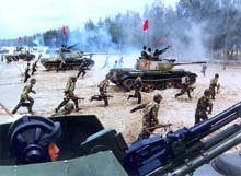 解放軍東海聯(lián)合演練 高科技與實戰(zhàn)融為一體(圖) 2002年08月19日 08:32 ![]() 步坦協(xié)同,席卷敵陣 ![]() 戰(zhàn)鷹突破空中防線 ![]() 獵潛艇劈波斬浪 ![]() 直升機臨空支援 中新網(wǎng)北京8月19日消息:中國官方媒體人民網(wǎng)昨晚發(fā)表解放軍在東海演習的照片,從照片中可以看到演習動用了坦克、軍艦、戰(zhàn)機和直升機。 據(jù)人民網(wǎng)報道,東海某海域進行三軍聯(lián)合作戰(zhàn)演習的南京軍區(qū)隊及配屬的?哲婈,把現(xiàn)代高科技與未來實戰(zhàn)需要融為一體,為全面掌握現(xiàn)代戰(zhàn)爭的特點和主動權﹑制勝權。 報道指,三軍將士以飽滿的熱情真打真練,能謀善戰(zhàn),斗志高昂,樹立了敢打必勝的信心。