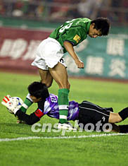 二零零二年中國(guó)甲A足球聯(lián)賽第十七輪賽事--北京國(guó)安對(duì)云南紅塔隊(duì)的比賽十八日晚在北京工人體育場(chǎng)舉行,國(guó)安隊(duì)?wèi){借國(guó)腳徐云龍的一粒入球而獲勝。圖為紅塔隊(duì)“國(guó)門”區(qū)楚良飛身在對(duì)手胯下?lián)渚入U(xiǎn)球。作者:毛建軍