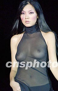 意大利著名服裝名牌“蓋·馬帝洛”,日前首次在北京舉行精品時裝展示會。圖為模特展示迷人的透視女裝。錢興強(qiáng) 攝