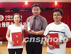 海南移動公司海口公司26日在?谂e行“金榜題名有好禮”活動。圖為該公司李振新總經(jīng)理(中)向考取清華大學(xué)的海南理科第一名王樹薇(右)和考取北京大學(xué)的文科海南籍第一名女學(xué)生韓冰(左)贈送GPRS手機(jī)。作者:王辛莉