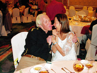 吃過了一兩道菜,楊紫瓊便逐臺(tái)去敬酒,還很豪氣要好事成雙,每人連飲兩杯。記者所見,楊紫瓊一個(gè)人也飲了差不多十支紅酒。鐘再思見女友如此高興,也拿出數(shù)碼相機(jī)拍下女友的豪情場(chǎng)面。楊紫瓊飲到略帶醉意,剛巧Star TV的高層在旁,他正表演伸長(zhǎng)舌頭頂上鼻尖,楊紫瓊也學(xué)他。結(jié)果對(duì)方的舌頭頂?shù)剿谋羌,?chǎng)面十分搞笑。