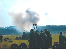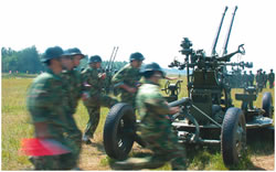 演習(xí)剛剛開始,一隊民兵在我高炮陣地附近忙碌著,他們很快設(shè)立了一個高炮陣地,原來他們是用報廢的高炮設(shè)置了一個假高炮陣地以迷惑來襲之“敵”。與此同時,另一隊民兵在旁邊給一枚導(dǎo)彈模型充氣,不到一分鐘,這枚同樣是用于迷惑“敵人”的地空導(dǎo)彈便豎立起來。
