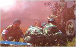 “敵”其他批次的轟炸機、巡航導(dǎo)彈不甘心失敗,仍在不斷臨近我軍保衛(wèi)的目標(biāo)。我高炮營對第二批次的兩架“敵機”進行集火射擊,在震耳欲聾的高炮聲中,1架“敵機”被擊中,另一架“敵機”未擊中我方目標(biāo)。不久,第三批次的3架“敵機”又飛臨我方上空進行襲擊,首先開火的是高炮營,而已經(jīng)機動到其他陣位的我便攜式地空導(dǎo)彈也隨即發(fā)射,一架“敵機”中彈后凌空爆炸!皵场钡谒呐窝埠綄(dǎo)彈接踵而至,我地空導(dǎo)彈、高射機槍、高炮同時開火射擊,陣地上響起一片各種武器發(fā)射時的聲響,巡航導(dǎo)彈被擊中冒出了黑煙。